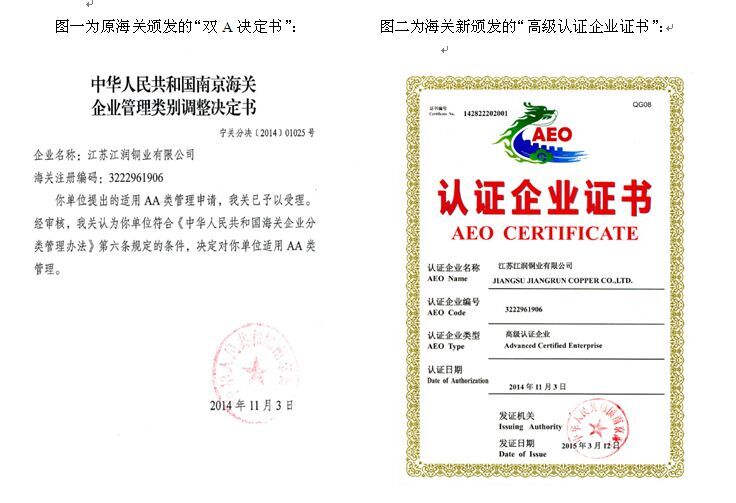 2015年7月30日,由無錫關檢貿組織的“共創共建”啟動儀式在無錫隆重舉行,參會企業共十五家。會議議程為原無錫市15家海關AA類管理的企業直接過渡為海關高級認證企業。江蘇江潤銅業有限公司榮獲由南京海關頒發的“高級認證企業”的稱號,公司總經理駱偉棟參會并領獎。《中華人民共和國海關企業信用管理暫行辦法》去年12月1日實施后,海關注冊企業的管理類別從原來的AA、A、B、C、D類劃分,改為按企業信用狀況劃分為認證企業、一般信用企業和失信企業,其中認證企業又分為一般認證企業和高級認證企業。認證企業在通關時適用較低的貨物查驗率,單證審核程序相對簡化,并可以優先辦理海關通關手續。 高級認證企業,除享有一般認證企業的通關便利外,其進出口貨物在確定商品歸類、原產地確定、海關估價和辦結其他海關手續前可先行驗放,由海關統一設立協調員,提供便捷通關服務。走出國門后,高級認證企業更可享受與中國實現AEO互認國家或地區海關提供的通關便利,這相當于直接獲得一張在全球有關國家或地區快速通關的VIP卡。