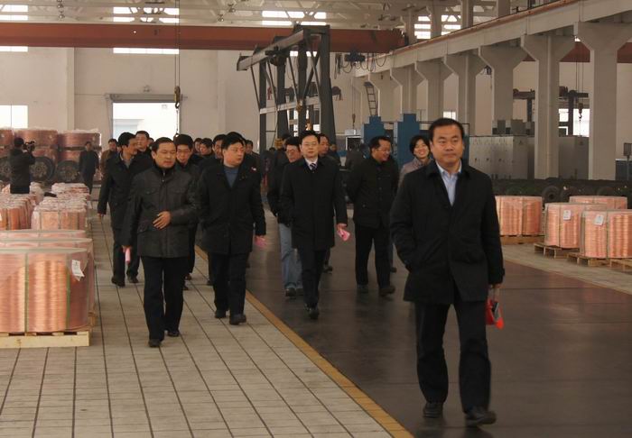12月21日上午,在市長王中蘇的陪同下,寶應縣黨政代表團來公司參觀考察。總經理駱偉棟熱情接待了代表團一行,并介紹了公司的發展歷程和前景。代表團參觀了SCR銅桿車間、復合銅線車間、銅絞線車間。